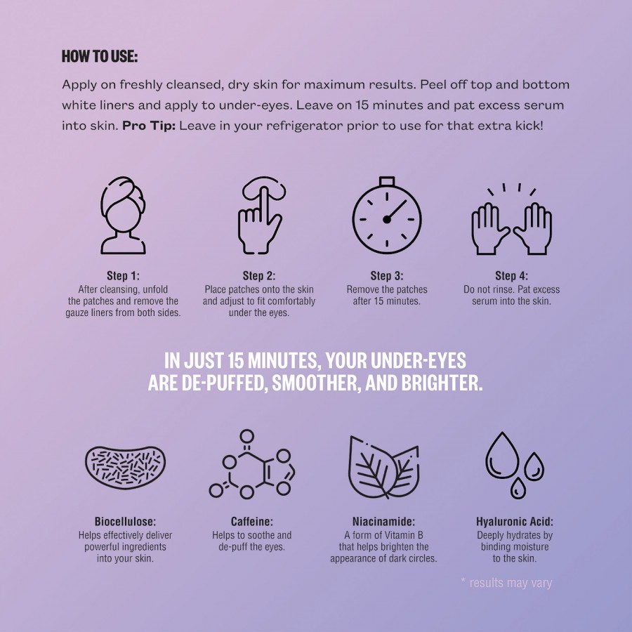 -After cleansing, place the patches onto the skin and adjust to fit comfortably under the eyes.