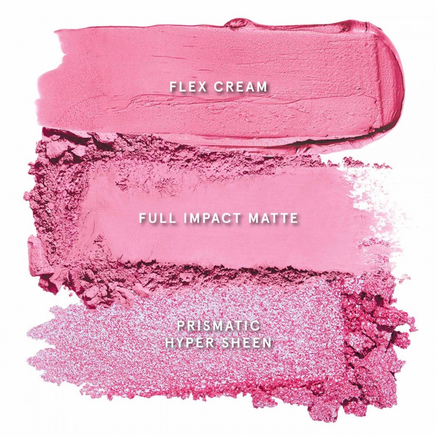 Each texture in this trio serves a unique purpose. Underpaint and overpaint with the Flex Cream shade, blur and build intensity with the Full Impact Matte shade, and get an eye-catching glow and seamless finish with the Hyper Sheen shade. The formulas smooth and soften, grip and extend wear, and give skin a silky finish. Wear each one alone or layer up to set the tone your way.