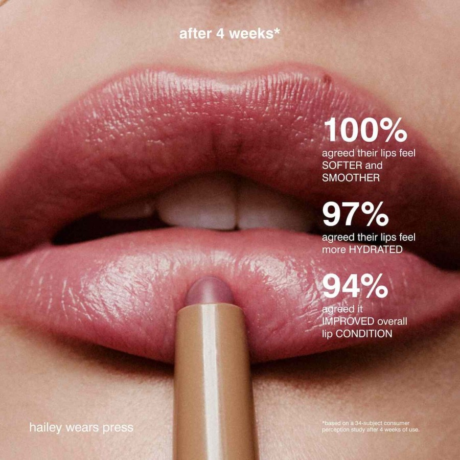 Glide Peptide Lip Shape along the outline of your lips and use the silicone smudger to diffuse the color or tidy up the edges. You can follow your natural lip line, overline for extra volume, or fill in your lips entirely.